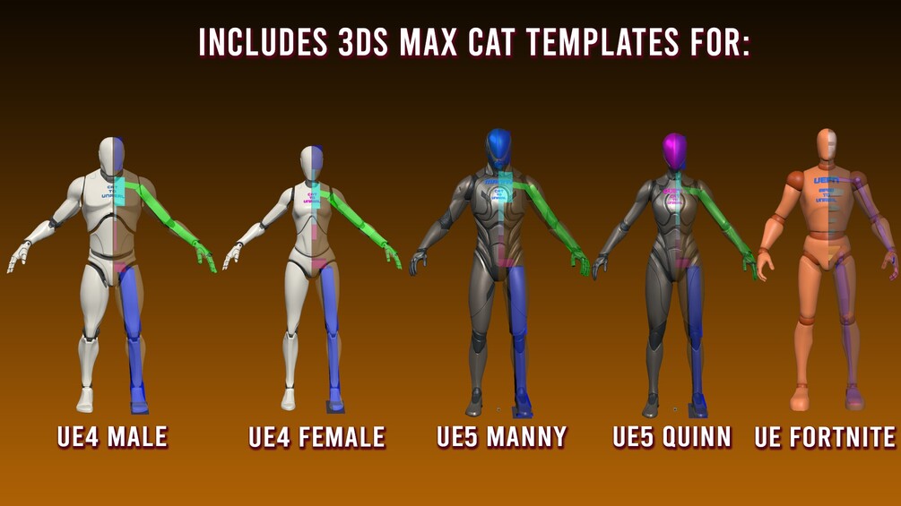 The EASIEST way for 3ds Max CAT users to export characters and animations to Unreal Engine. These templates allow 3ds Max users to animate with CAT and export to Unreal Engine without any need for retargeting. Resulting exports will be fully compatible with all Unreal Mannequins.
